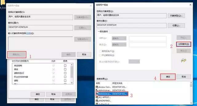 4、选择用户或组点击【高级】--【立即查找(N)】--【Administrators】,最后点击【确定】三次。