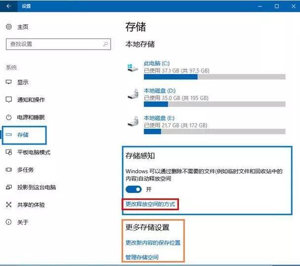Win10 1703以上版本支持的存储感知功能,能让系统通过删除不需要的文件(如临时或回收站内的文件等)来自动释放空间。