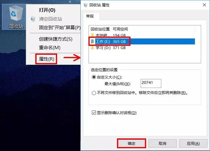 右击桌面【回收站】,选择【属性】,点击回收站存放位置,设置最大值后【确定】。