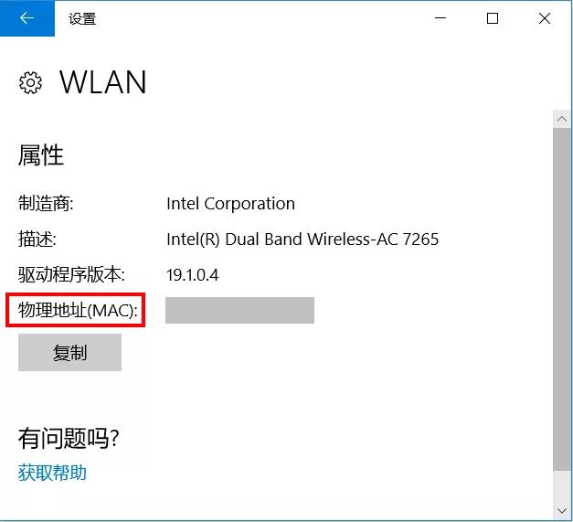 首先找到需绑定的设备的无线网卡MAC地址。以WIN10系统机台为例,右击开始菜单点击【设置】,依次进入【网络和Internet】【WLAN】【硬件属性】查看【物理地址(MAC)】。