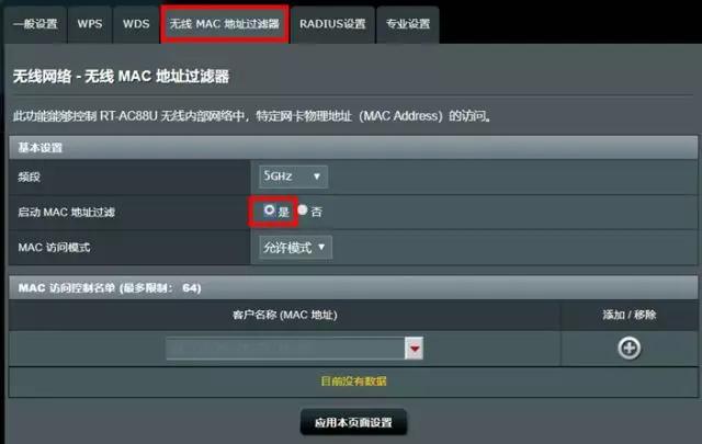然后在路由设置界面(华硕路由通常为【无线MAC地址过滤器】选项中)添加上述设备的MAC地址。这样,未绑定的设备就无法使用网络了。
