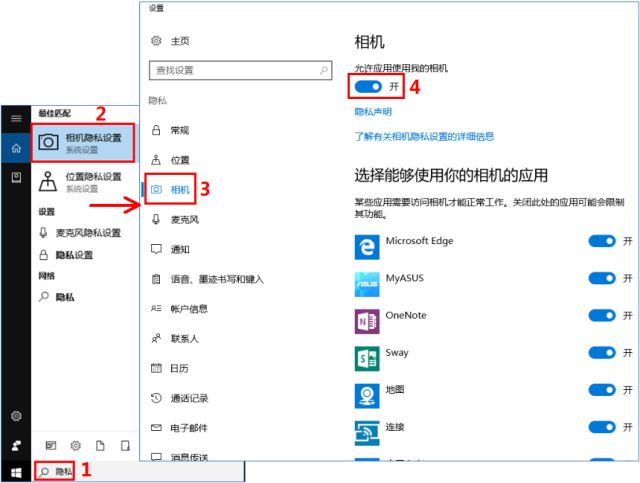 首先确认相机是否开启。在搜索框输入【隐私】,选择【相机隐私设置】,在弹出窗口点击【相机】,将“允许应用使用我的相机”设为【开】。