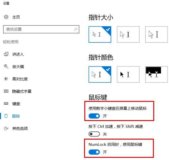 关闭【使用数字小键盘在屏幕上移动鼠标】、则自动关闭【NumLock启用时,使用鼠标键】,此时则打开NumLock输出数字,关闭NumLock输出方向键。