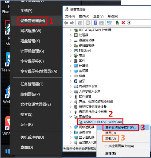 如果还是无法使用,可以右击开始菜单进入【设备管理器】,双击【图像设备】,右击摄像头设备选择【卸载】,按提示完成并重启。或者选择【更新驱动程序软件】,点击【自动搜索更新的驱动程序软件】,按提示完成并重启。