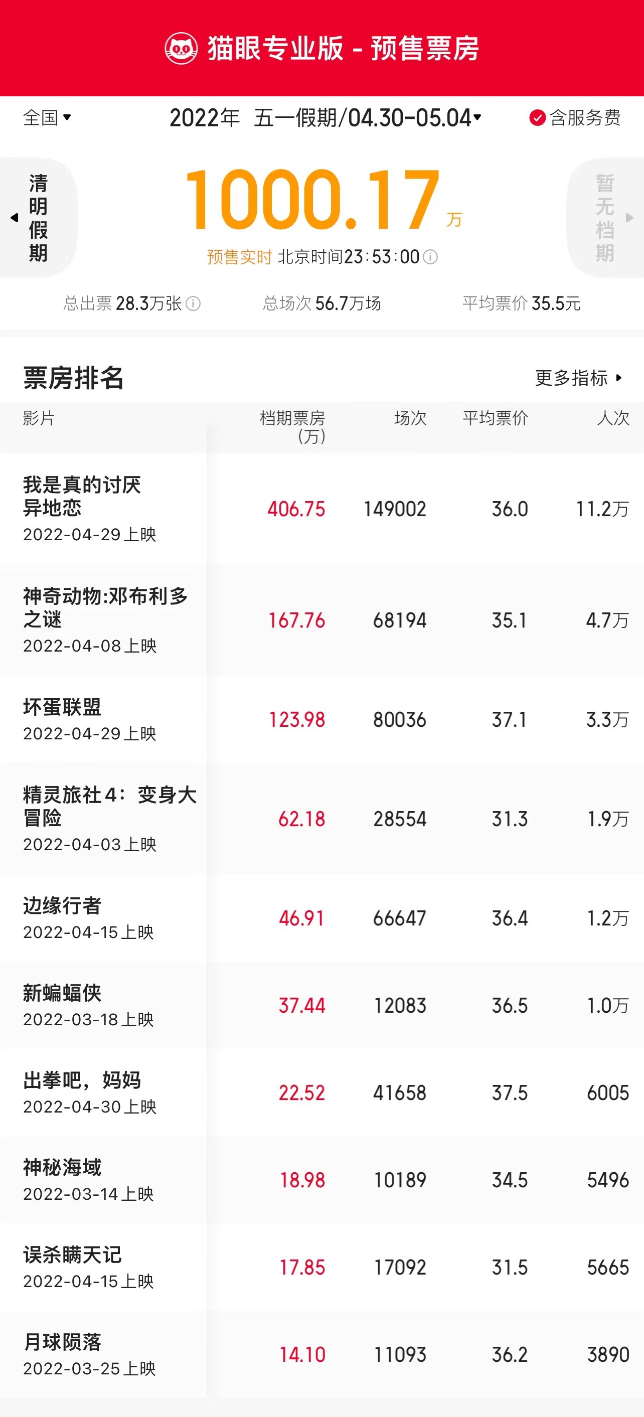 从猫眼昨天的数据来看,2022 年 4 月 29 日 23 时 53 分,2022 年五一假期(04.30-05.04)预售总票房刚刚破千万。猫眼专业版数据显示,2022 年 4 月 30 日 9 时 17 分,2022 年五一假期首日票房破千万。