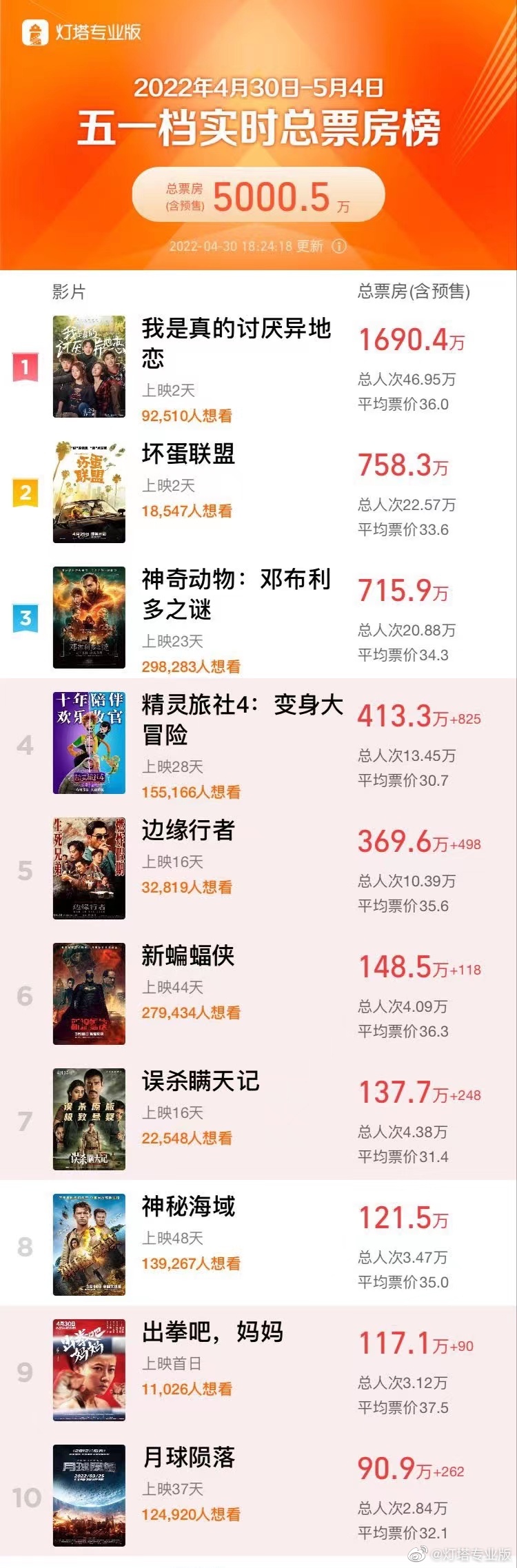 据悉,《我是真的讨厌异地恋》、《神奇动物:邓布利多之谜》、《坏蛋联盟》三者平均票价都在 35 元左右,人次分别达 48.5 万、22.5 万、20.9 万。
