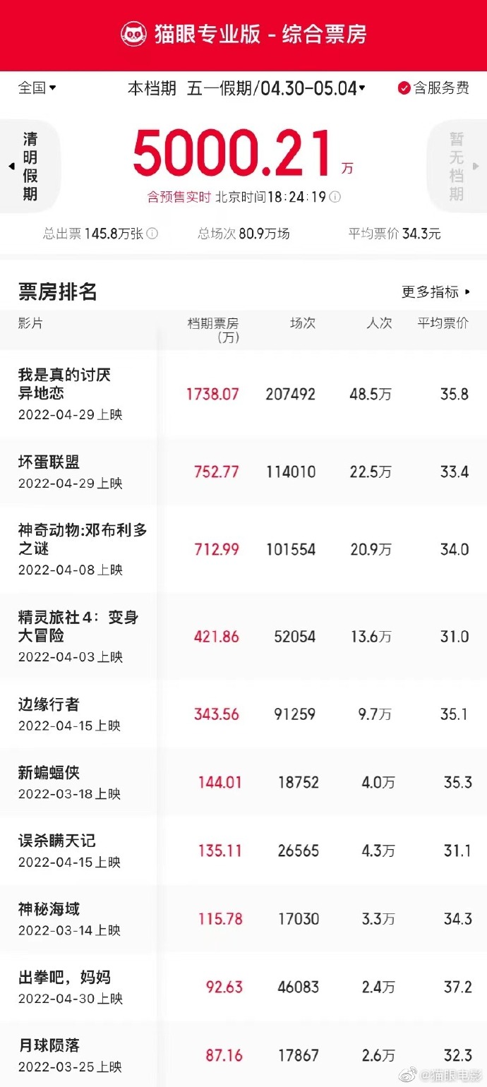 30 日消息,据猫眼专业版数据,2022 年 4 月 30 日 18 时 24 分,2022 年五一假期(04.30-05.04)总票房(含预售)破 5 千万元,估计今天是破不了一亿元了。