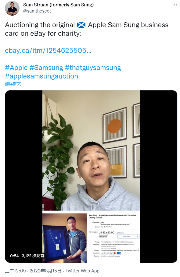 22 日消息,一名使用“Sam Sung”名字的前苹果 Apple Store 零售店员工以慈善名义将一张旧名片和员工 T 恤进行拍卖。